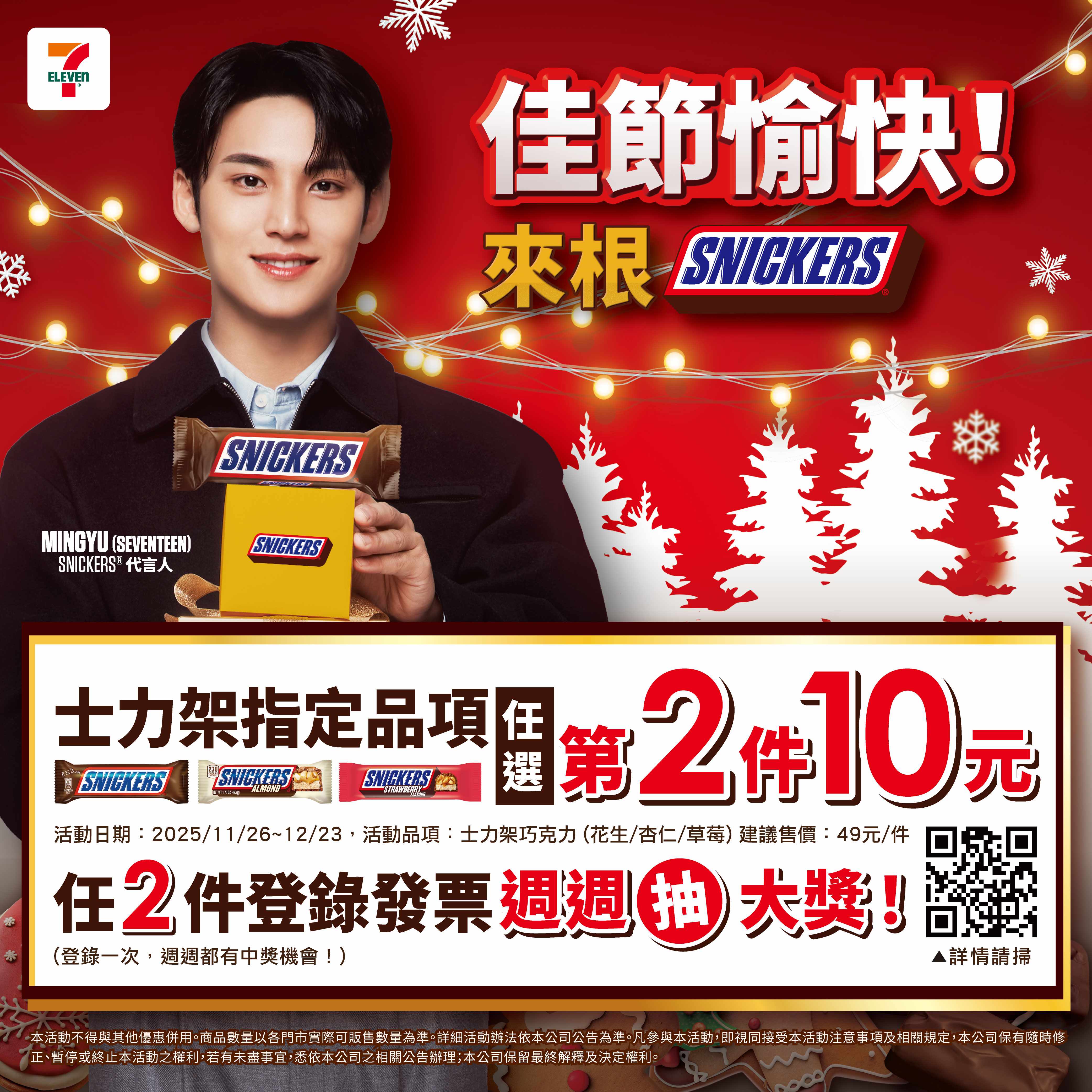 2. 兌獎之購物發票有效期間為2025年11月26日~ 2025年12月23日,且於7-ELEVEN超商消費,發票明細須可清楚辨識購買品項為「士力架 / M&M’s / 麥提莎指定品項任兩件」。