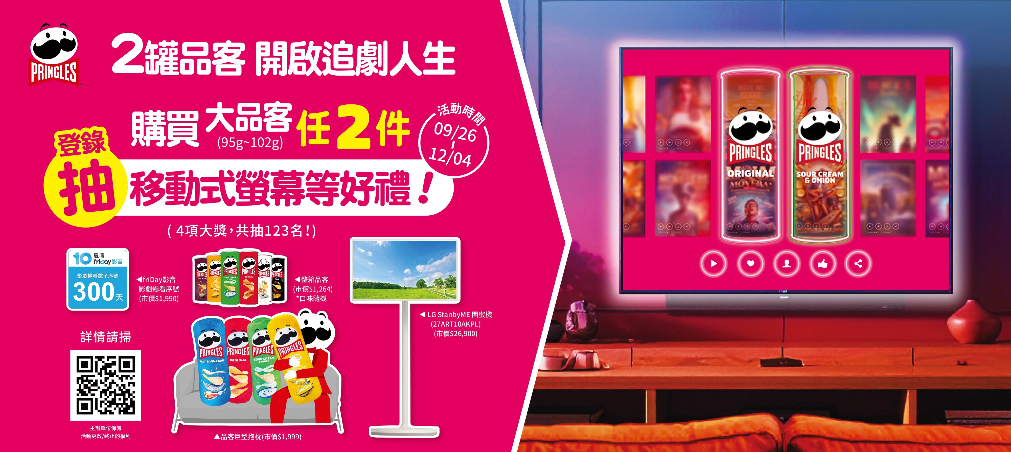 活動期間內於全通路單筆購買"大品客(95g~102g)系列商品任2罐",憑購買發票於本活動網站完成登錄發票流程,即有機會抽中追劇神器「LG StanbyME 閨蜜機 無線可移式觸控螢幕」、「遠傳friDay影音影劇暢看序號300天」等好禮!