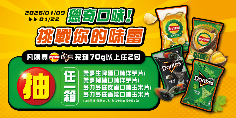 樂事生啤酒口味洋芋片/樂事榴槤口味洋芋片/多力多滋皮蛋口味玉米片/多力多滋香菜口味玉米片,任一箱 (口味隨機)/位,共150名