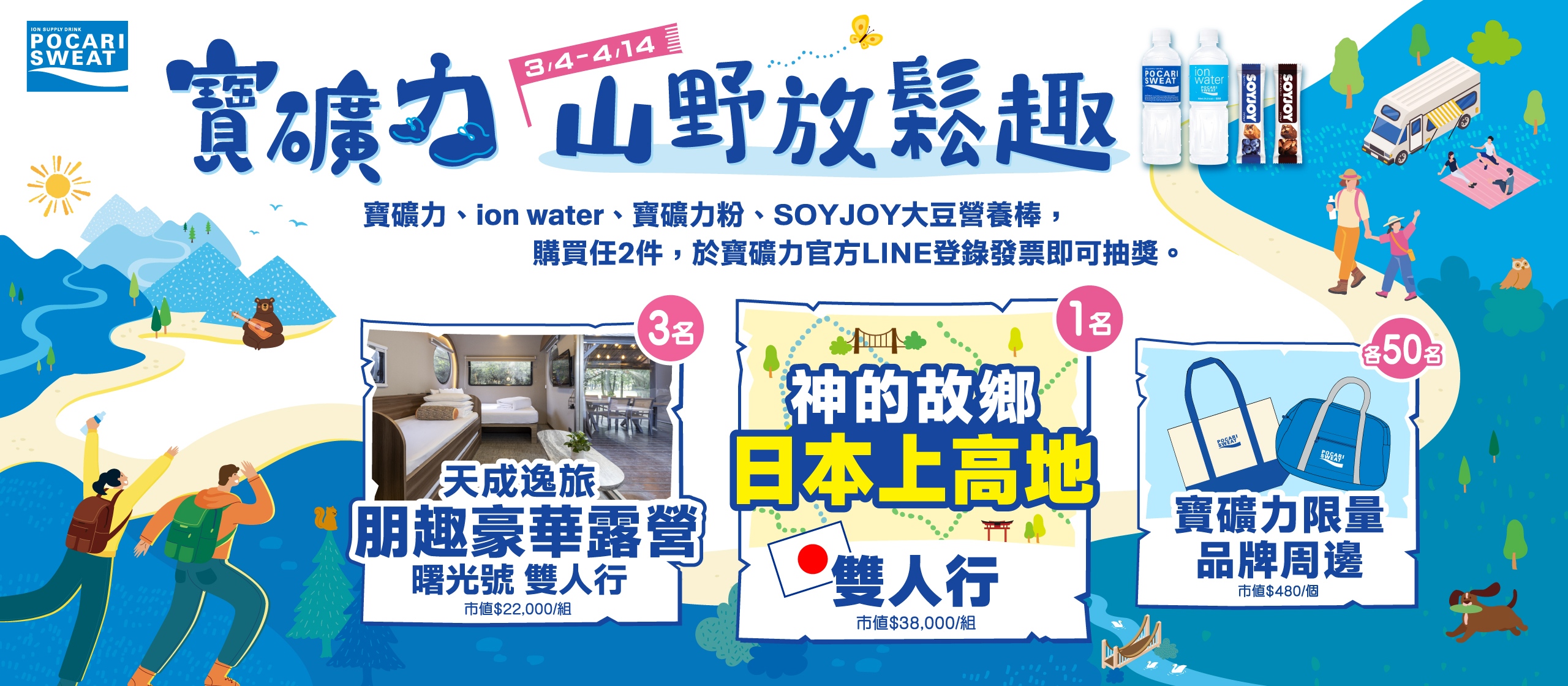 2. 登錄方式: 加入寶礦力水得LINE官方帳號好友,憑購買發票完成登錄流程,即有機會抽中「日本神的故鄉-上高地雙人行」、「朋趣豪華露營 曙光號一泊四食雙人行」、「寶礦力限量品牌周邊-帆布提袋/摺疊旅行包」,於7-ELEVEN及全家便利商店購買,還可再抽獨家好禮!