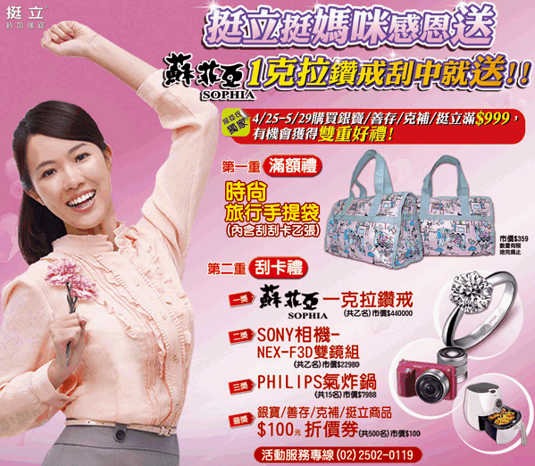 即日起至2013年5月29日止,於屈臣氏購買銀寶/善存/克補/挺立滿$999,有機會獲得雙重好禮! 第一重滿額禮時尚旅行手提袋一只(內含刮刮卡乙張)。第二重再刮蘇菲亞1克拉鑽戒(市價$440,000) 。